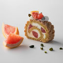 ピスタチオのキュイエールとパティシエールに爽やかなカルピスを加えたシャンティで、ピンクグレープフルーツをくるり。ピンクグレープフルーツを忍ばせることでアクセントとなる心地よい酸味がピスタチオの濃厚 な味わいを支えています。これからの気候にぴったりの後味爽やかなロールケーキです。